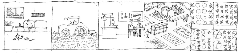 To ensure the functionality of the cell, each hub includes components to support production, and components to support community. Each component addresses one or more aspect central to the Diverse Rural Lab: work, make, live, play, and research. To support production, each hub includes a centralized machines, tools, equipment, and experts to run and maintain these tools. Tools and tool experts can move from the hub to production areas depending on the need. Since the production in this system is very diversified, the hub needs a continuous development of new tools. This is managed through a research and design workshop in the hub, where experts, universities, and the rural lab communities collaborate to create new tools.[1] Different cells can also support each other’s in this case. In addition to the tool center, each hub includes a seed bank, a center for agricultural supplies, and a central storage area for agricultural fresh and processed produce. Each of these units will also be run by specialists working with the ABC company.
