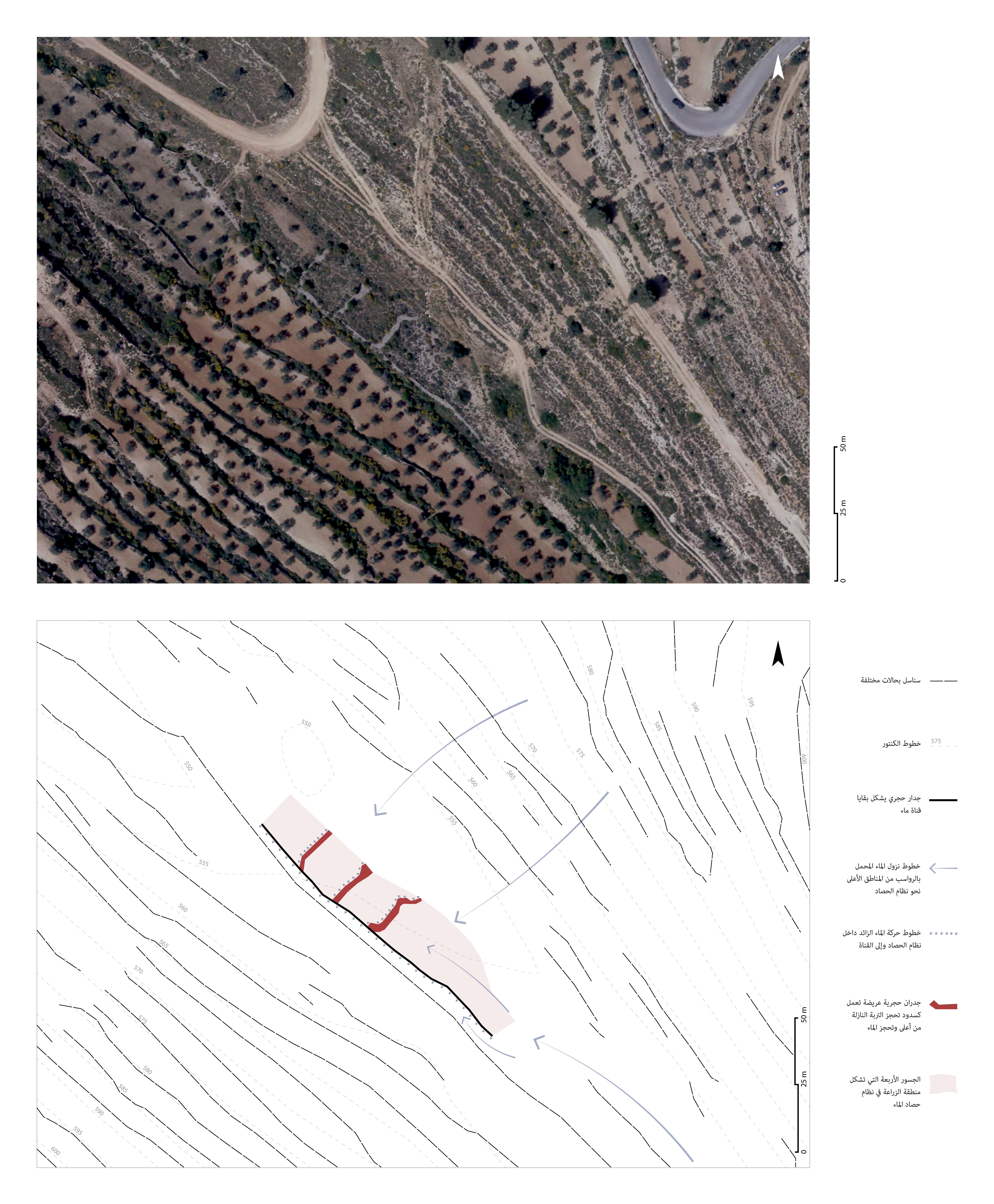 توجد العديد من أنظمة حصاد الماء المنتشرة في فلسطين، ولعل أكثرها حضورًا في الكتابات الأكاديمية الأنماط المختلفة المنتشرة في صحراء النقب.[1] في الواقع، عادةً ما يتم ربط حصاد الماء بالمناخ الجاف وشبه الجاف، ربما لندرة الماء في هذه المناخات وصعوبة الزراعة فيها دون حصاد ماء.[2] يقصد بحصاد الماء “حرمان جزءٍ من الأرض من نصيبه من المطر وإضافته إلى حصة جزءٍ آخر،” أو على الأقل نقل جزءٍ من حصة أرضٍ ما إلى أرضٍ أخرى، وهذا يستلزم توظيف تقنياتٍ مختلفةٍ “تجمع الماء وتخزنه، أو تزيد الجريان السطحي المتقطع أو كمية المياه الجوفية.”[3] وعادةً ما يتكون نظام حصاد الماء من أربعة أجزاءٍ (أو بعضها): منطقة التجميع، ونظام نقل الماء أو تحويل مساره، ومنطقة تخزين الماء، ومنطقة الهدف أي الاستخدام للماء المحصود.[4] ومن بين أنظمة حصاد الماء في جبال وسط فلسطين، تبرز آبار الجمع والمصاطب الزراعية التي تسير مع خطوط المناسيب.[5] وإضافةً إلى المصاطب وآبار الجمع، تمكنت الباحثة من الوصول إلى نموذجين لنظامين آخرين أقل انتشارًا في المشهد، الأول في وادي العقدة في رام الله، والثاني في سنجل، وستكتفي الدراسة بتحليل نظام وادي العقدة.