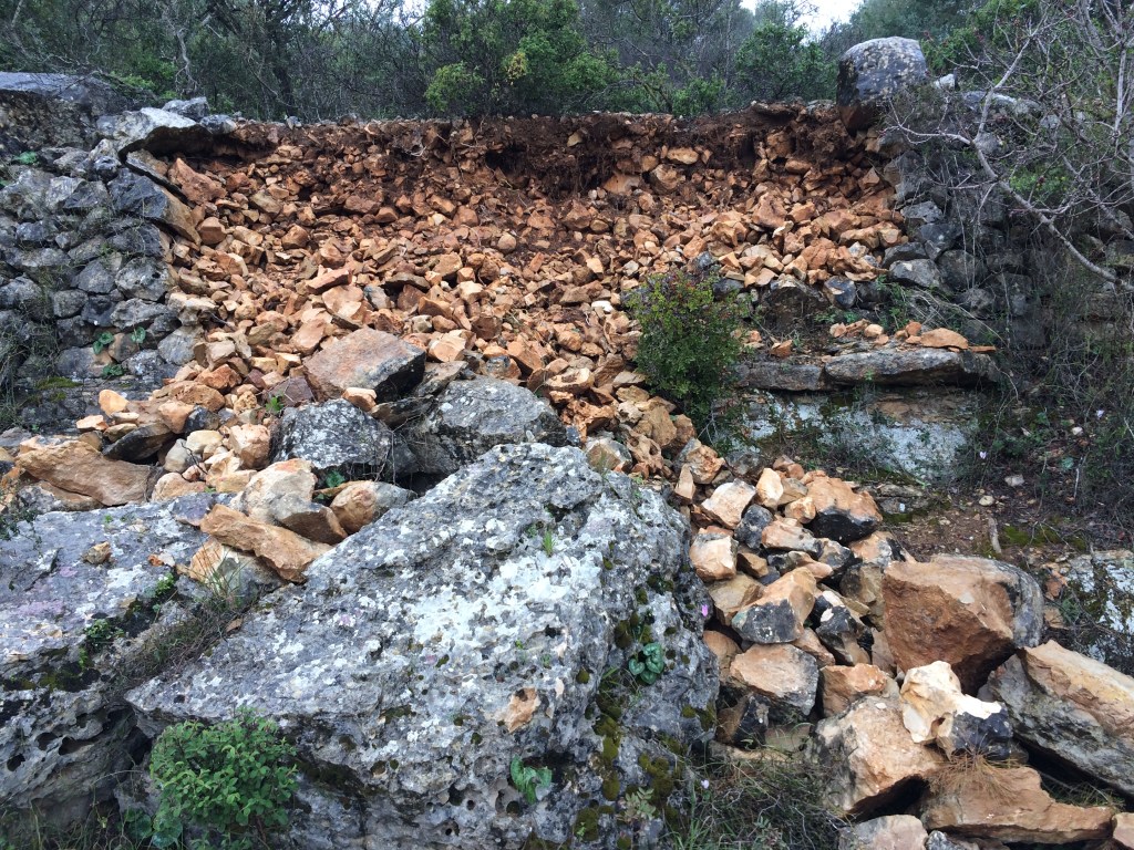 صورة رقم (1): سنسلةٌ منهارةٌ في وادي العقدة – رام الله، تظهر كمية من التربة التي كانت محميةً بالسنسلة، وبدأ جزءٌ منها بالانجراف نتيجة انهيار السنسلة. تصوير الباحثة، 18 آذار 2022.